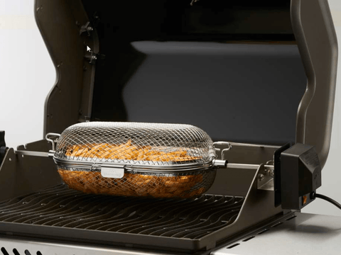 Things just taste better when they're barbecued and with the Napoleon Rotisserie Basket it's easy to make wings, french fries, and so much more right on the grill. The Rotisserie Basket's rod ports fit most rotisserie rod styles and lock in place with the thumb screws. Once you've created the most delicious wings, crispiest fries, and grill roasted veggies without the addition of oil, the stainless steel baskets clean up easily, then nest for space saving storage.